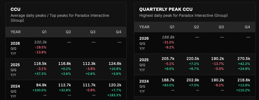 This is also where Paradox looks comparatively more vulnerable today. A model with high pricing power works best when the player base is growing, or at least when new releases clearly lift activity and earnings. There are signs that the tailwind from COVID and hits like Hearts of Iron and Crusader Kings is no longer as strong. Player base growth doesn’t appear to have grown over the past two years despite several new core titles being added, beyond isolated spikes at launches and so-called “free weekends”. The price increases they’ve had to push through over the past two years have therefore increasingly looked like a way of paying the collection notice for missing growth from shareholders.