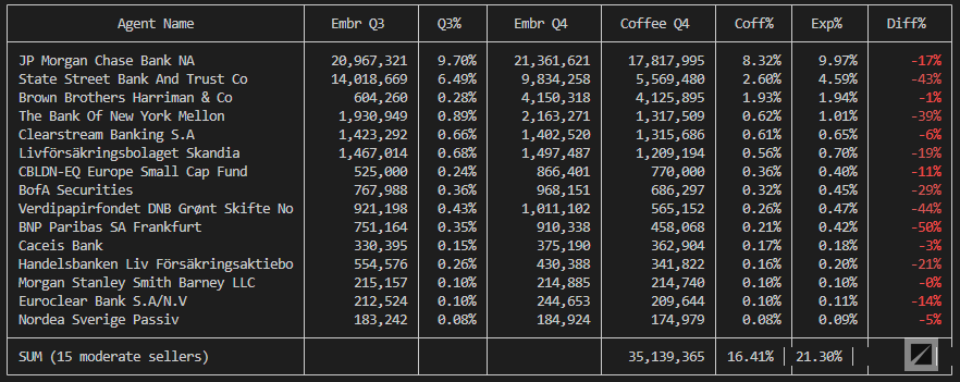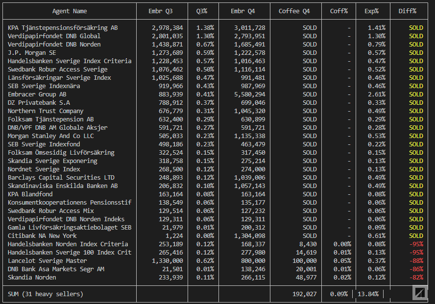 For Coffee Stain there’s reason to start with the shareholder register rather than the drama. The stock has fallen around 30 percent this year but a good deal suggests that a larger part of the pressure has been technical. When the company landed on the small First North list, holdings were forced out of portfolios with mandates that don’t allow an unregulated marketplace along with size restrictions. Before year-end, around 36 percent of the shares were traded. 19 percent of those are identified in the tables below. Since then up until beginning of march, an additional roughly 25 percent of the share capital has changed hands. After year-end, institutional movements likely followed tied to the restructuring of the AP funds which are giant institutional behemoths packing thousands of billions in assets under management. Where AP1’s holding of approximately 4.4 percent may have become yet another part of the flow pressing the stock when those shares moved to AP3 and AP4 and triggered unconstrained selling.