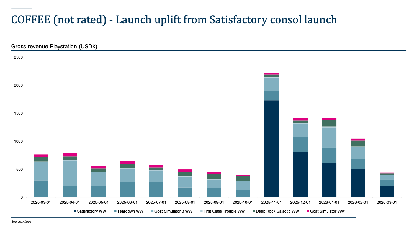 After that comes Valheim, where the expansion to PlayStation and Switch 2 becomes important. Console broadens the player base both organically and through better conditions for cross-play. This is also particularly relevant since the Early Access model as a rule has significantly worse visibility and weaker distribution on console than on PC, something I think is underestimated by the market. When Valheim later this year is expected to reach version 1.0, there are therefore conditions for a clear uplift in both player count and price, if Satisfactory’s 1.0 launch is any guide.