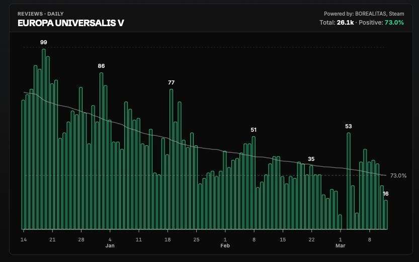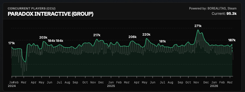 On monetisation specifically, Paradox has pushed their model harder. Expansions and add-ons are released frequently, at a high price. They’ve been able to charge a premium from an audience with unusually high pain tolerance for pricing for a long time. Call it pricing power, which doesn’t come free. When prices go up at the same time as the content is perceived as increasingly thin, friction emerges. This has been visible in the reception of a large portion of the company’s expansions in recent years. What on paper looks like strong monetisation can in the next step erode trust among the most loyal players.