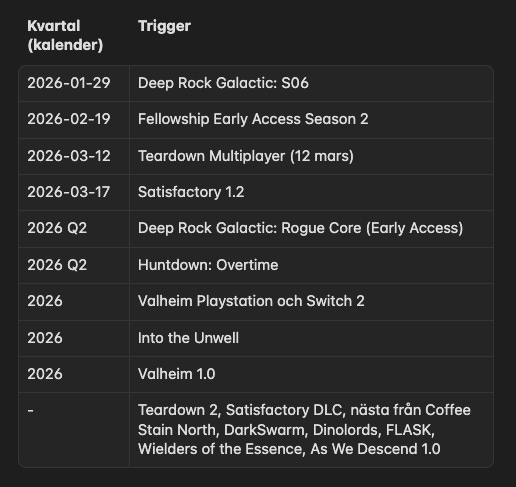 In the current quarter the pipeline is somewhat thinner than the previous one, which beat analyst expectations, but not empty. Deep Rock Galactic: S06 has been released alongside Teardown Multiplayer. At the same time, Satisfactory 1.2 is expected to hit the developer branch next week. Less sequential pressure but should still be enough to avoid negative growth versus last year despite weaker currency. That would be important not least optically. Because then the company can enter stronger coming quarters with a bottom behind it rather than a continued declining curve where the market keeps pushing the inflection point further out.