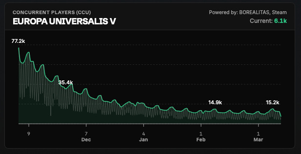This has shown up in several concrete examples. With Cities: Skylines II it became clear how high expectations can quickly turn to disappointment when delivery falters. The game has wrestled with the same player numbers as its predecessor and the console port has dragged out nearly 3 years. Victoria 3 didn’t become a quick path to profitability either despite a popular IP. Especially not if you factor in costs for continued work on expansions and support after release. On expansions specifically, I estimate that today’s Paradox spends roughly 50% of its development costs, which also demands a significant price tag from players, and that’s where the bulk of earnings come from. Europa Universalis V, which came out this year, was supposed to be the company’s next magnum opus. But has instead sold significantly weaker than analysts expected and met criticism from players that updates so far don’t appear to have turned around. Quite the opposite.