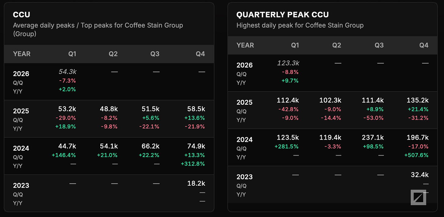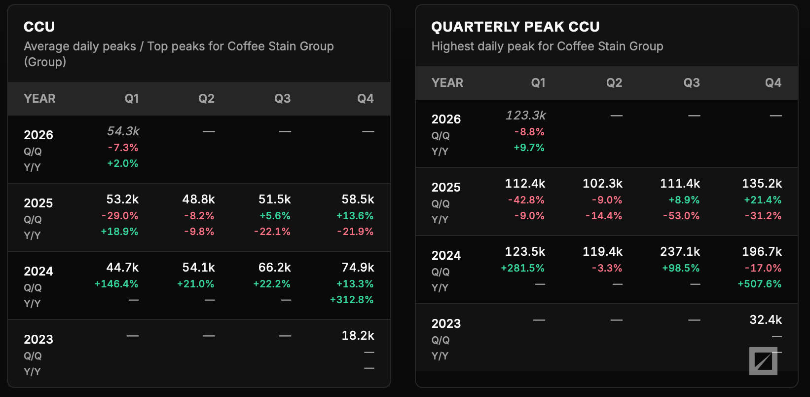 From that perspective it’s therefore difficult to see a broad and unambiguously declining trend in Coffee Stain’s game portfolio on PC. But there’s one clear exception in Deep Rock Galactic, which showed declining sequential CCU development for six straight quarters after the launch of season five in Q2 2024. For an “always-online” audience, this is an eternity without updates. But even there, there’s a more tangible explanation than players or the studio having lost interest. The Danish studio Ghost Ship Games simultaneously put all its resources on the sequel Deep Rock Galactic: Rogue Core, which meant season six was delayed a full seven quarters. To get the new season in place, they ultimately chose last year to move the season’s development to sister studio Invisible Walls. When the season launched in the current quarter, it drove back a large number of players and sales.