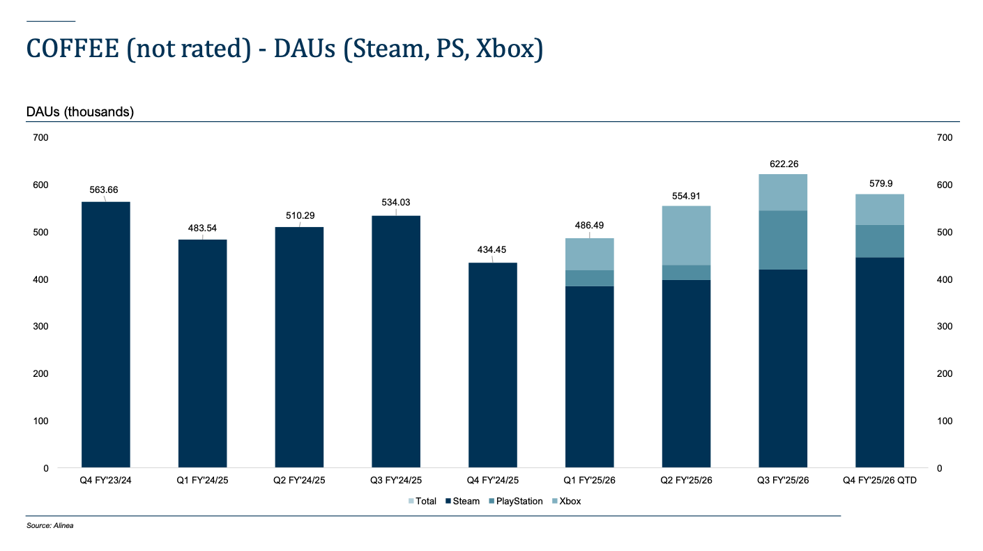 Furthermore, Valheim is expected to come to PlayStation and Switch 2 during 2026. That console is an important platform for understanding the full puzzle is evident not least when you look at Goat Simulator. That was the game that put Coffee Stain on the map, a sandbox game built on chaos and viral power. Looking at Steam alone, the picture isn’t exactly exhilarating. The CCU peak sits at a meagre 3,500 and sales on the platform are estimated between half a million and a million copies. In context, low numbers to justify having a studio of 31 people working on the IP. But here too many go wrong when analysing Coffee Stain, since the game has a strong foothold on console including several so-called “platform deals”, one of which we saw last quarter.