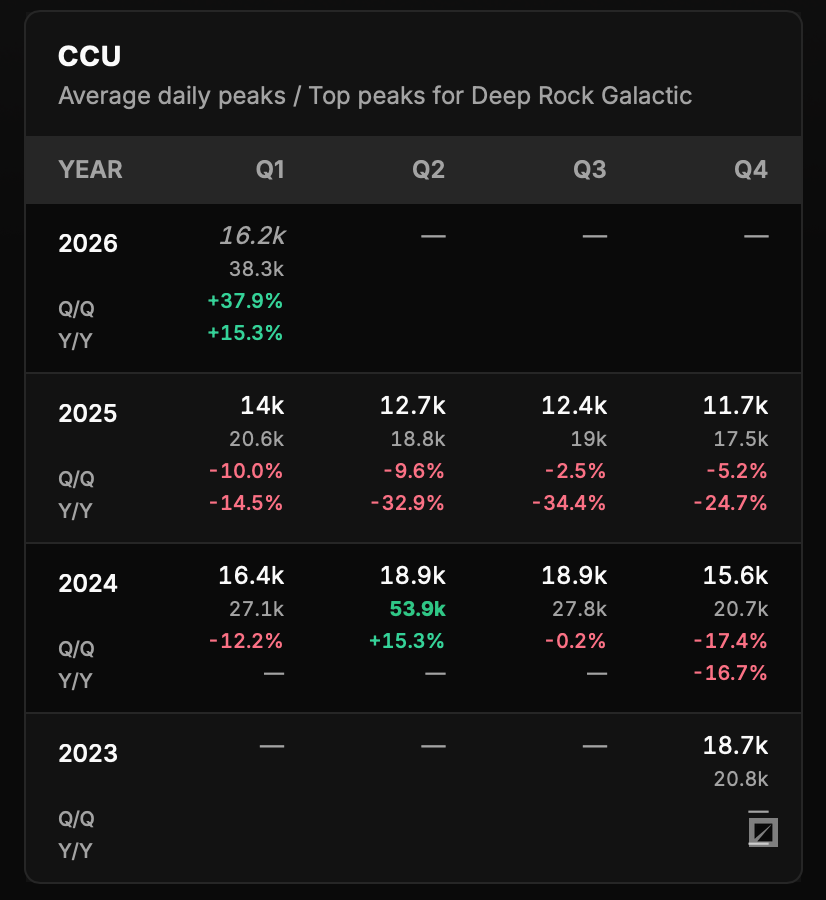 On a slightly longer horizon, Deep Rock Galactic: Rogue Core is the clearest trigger. The company was expected to announce a launch date on March 12 and expectations lean toward a launch during Q2 this year. The game has been shown in several playtests and streams recently, which have been received very well with review scores above 95%.