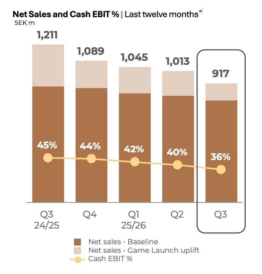 With relatively conservative assumptions for the coming twelve months built on roughly 150 thousand copies from Teardown Multiplayer, 500 thousand from Rogue Core, 1 million from Valheim, and 300 thousand from Into the Unwell sold in their respective launch quarters. While the rest of the catalogue is assumed to be largely unchanged, the forecast points to SEK 400 to 450 million in Cash EBIT, with consensus around SEK 440 million. This can be compared to a floor level of roughly SEK 300 million and a consensus of about SEK 330 million for full-year 2025. With an enterprise value of approximately SEK 3.1 billion at around SEK 16.6 share price plus minor adjustments for earn-outs and leases, that means it trades at 7–8x next year’s Cash EBIT. Compared to approximately 9–10x the current year forecast with one unknown quarter.
